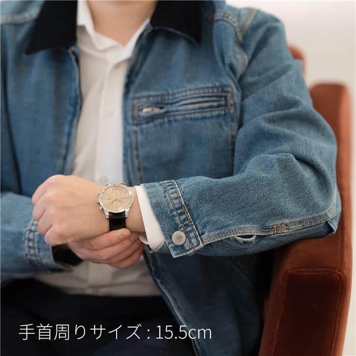 端正なアラビア数字とリーフ針、上品なベージュの文字盤が調和し、美しいフェイスを作り上げています。