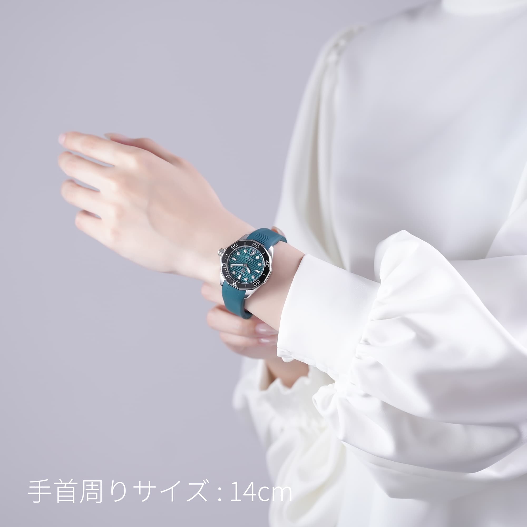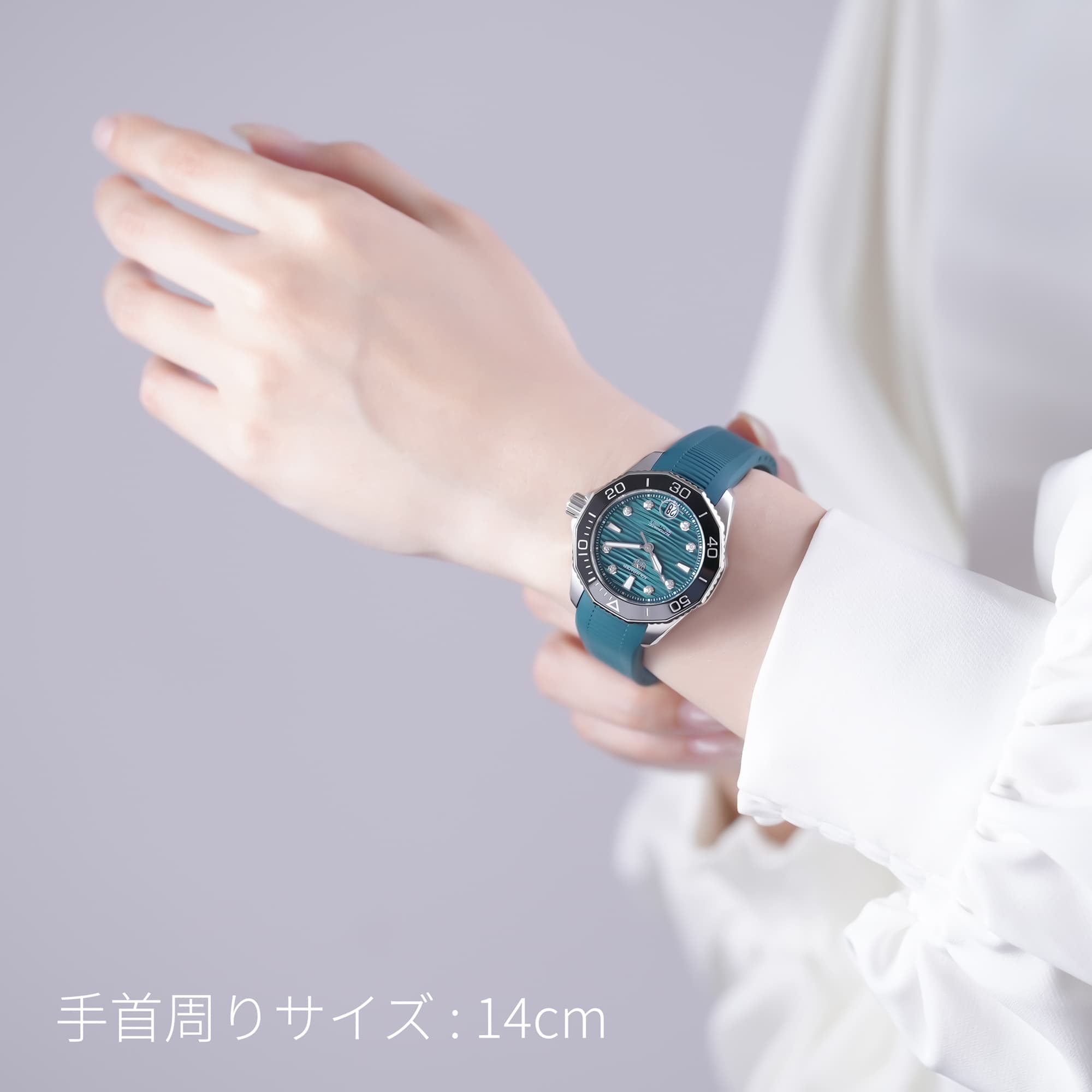 波模様のグリーンダイアルが美しい、「アクアレーサー プロフェッショナル300」セラミック製の逆回転防止型ベゼル、ねじ込み式リューズ仕様など、ダイバーズウォッチとしての機能はそのままに、8つのダイヤモンドインデックスにより、エレガントな仕上がりとなっています。ムーブメントには、自動巻きキャリバー5を搭載。スポーティさとエレガントさが融合したモデル。ケースサイズは36mmなので、男女問わずご使用いただけます。ラバーストラップの快適な装着感も相まって、オンオフ問わず活躍してくれる一本です。
