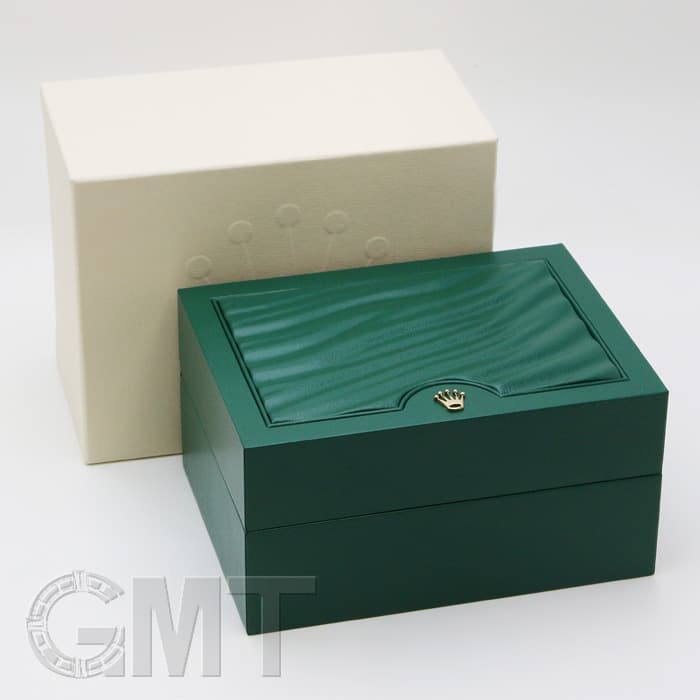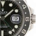 精進な黒文字盤に、ROLEXカラーの緑色で彩られたモデル名とGMT針が映えます。