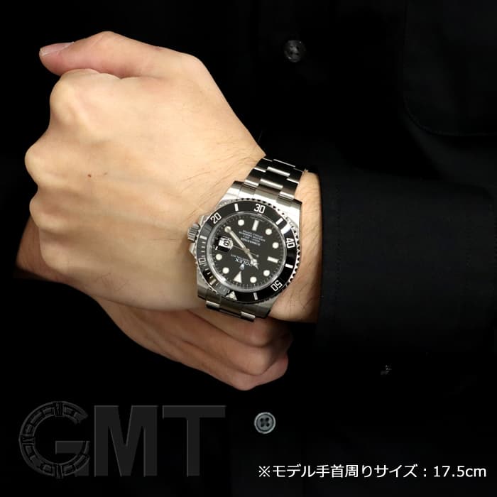 左の写真では、手首回り約15.5cmのスタッフが試着したシーンです。 スーツに合わせて装着すると、セラミック製ベゼルの輝きがより高級な雰囲気を演出してくれます。 |