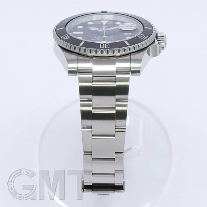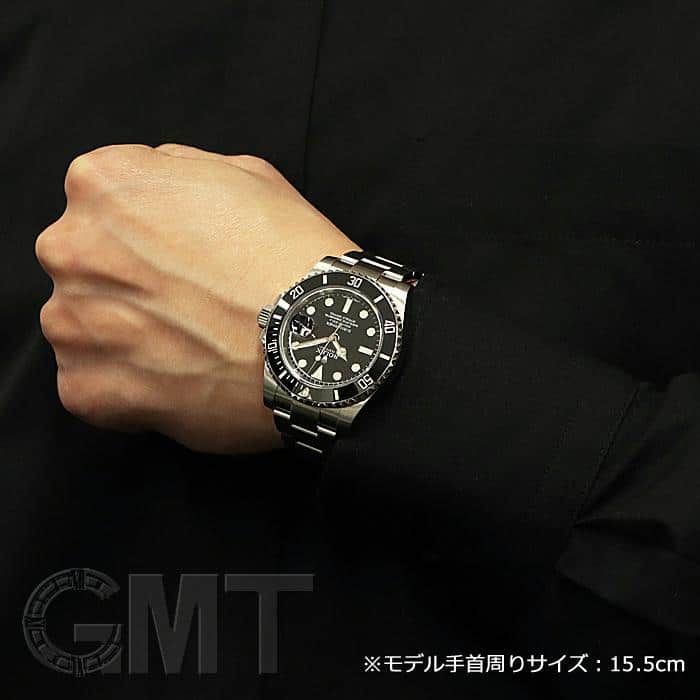 左の写真では、手首回り約15.5cmのスタッフが試着したシーンです。 スーツに合わせて装着すると、セラミック製ベゼルの輝きがより高級な雰囲気を演出してくれます。 |