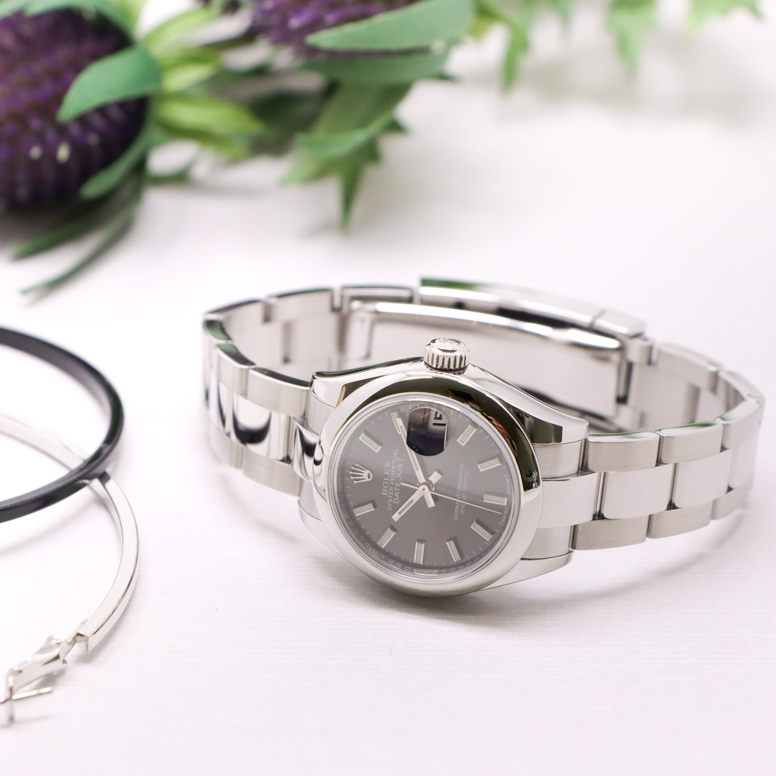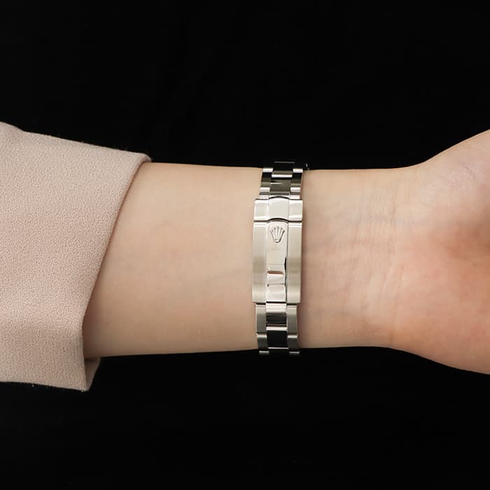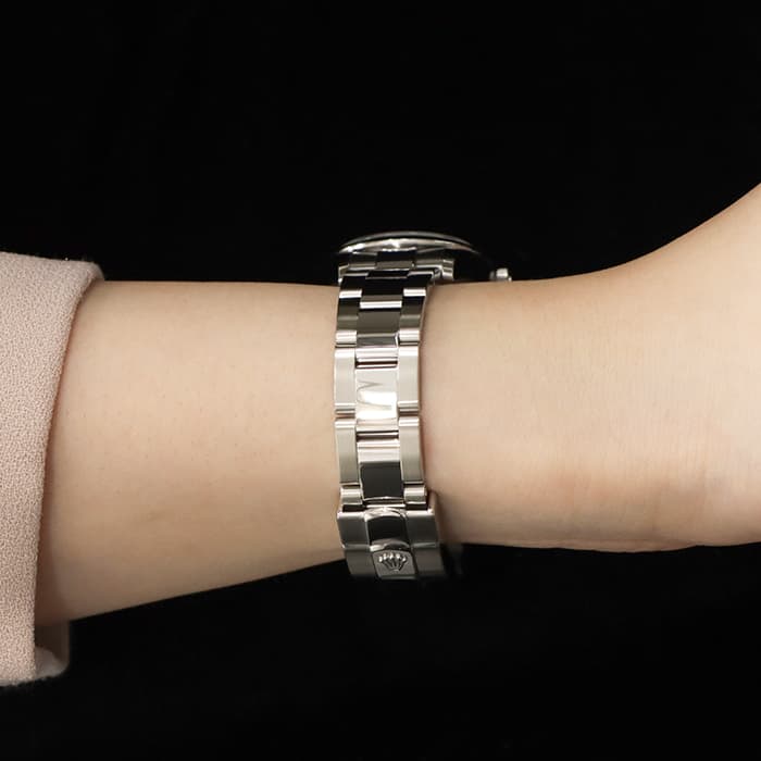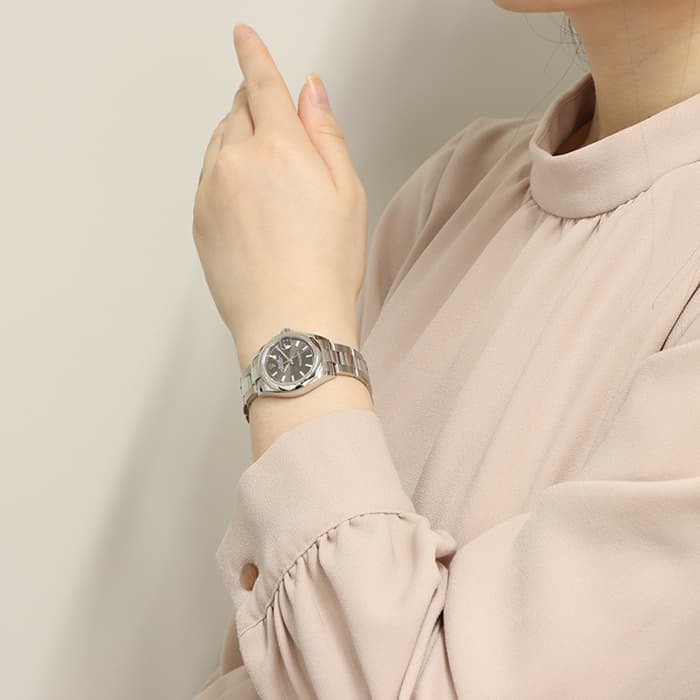 「デイトジャスト」は流行に左右されない普遍的なデザインが魅力の腕時計です。スムースベゼルに3連のオイスターブレスレットの組み合わせは、シンプルでありながらも洗練された印象があります。ダークグレーの文字盤は落ち着いていて、大人の女性にぴったりなカラーです。ムーブメントには完全自社製造の自動巻き式「Cal.2236」を搭載。ロレックスが特許を取得したシリコン製シロキシ・ヘアスプリングを備えた特別なムーブメントは他に類を見ない精度を保つように設計されています。パワーリザーブも55時間なので、週末外していても週明けにもまだ駆動している嬉しい仕様です。