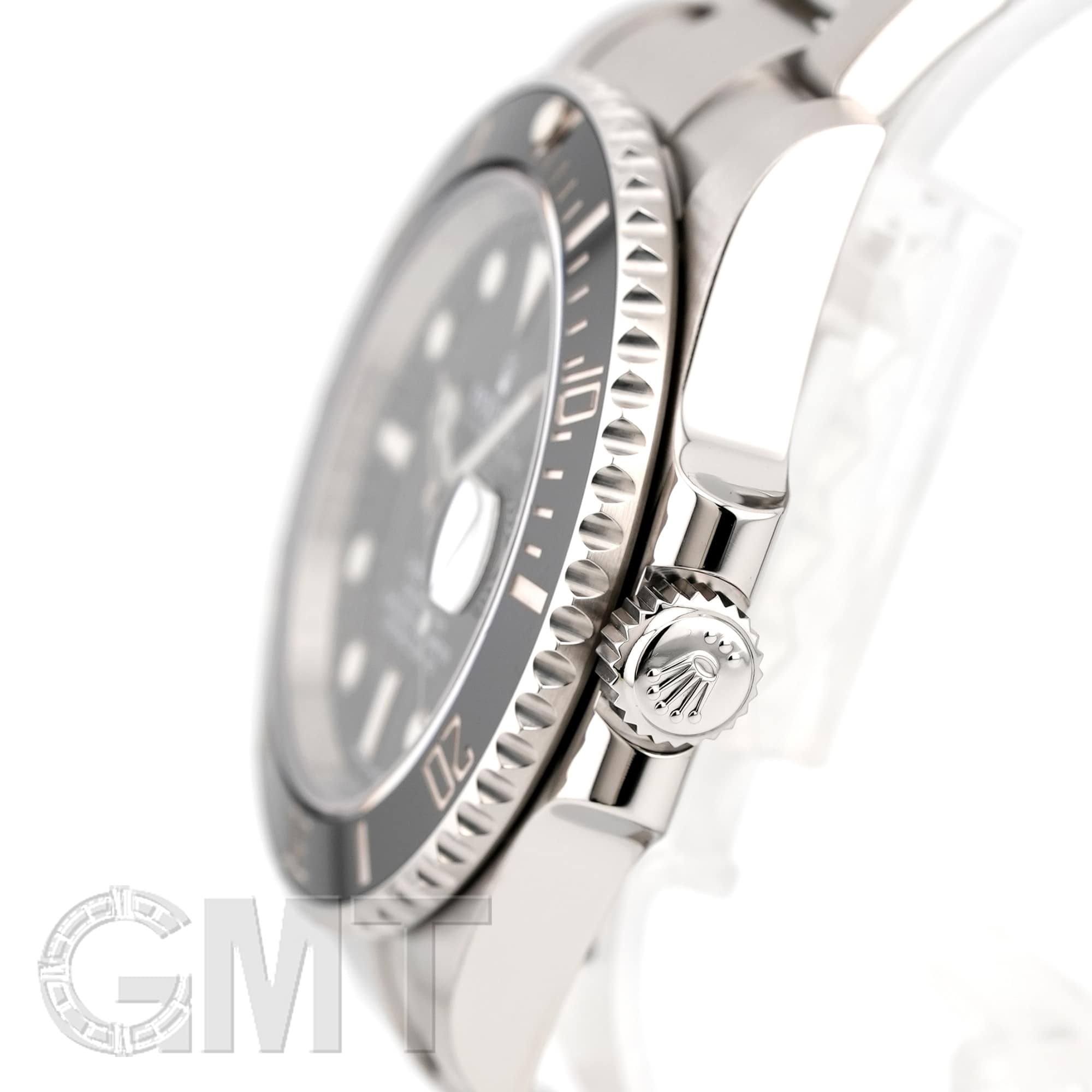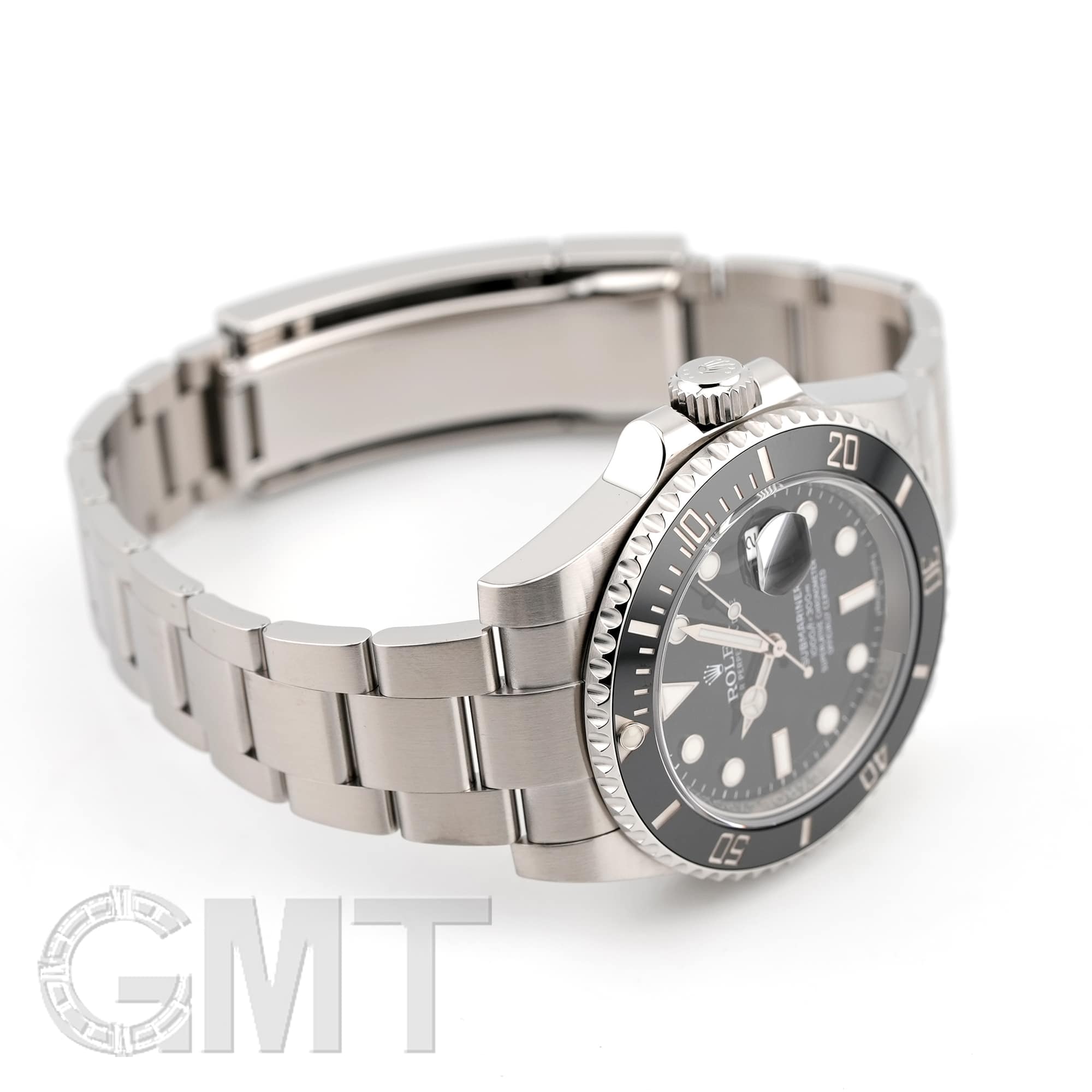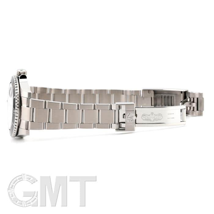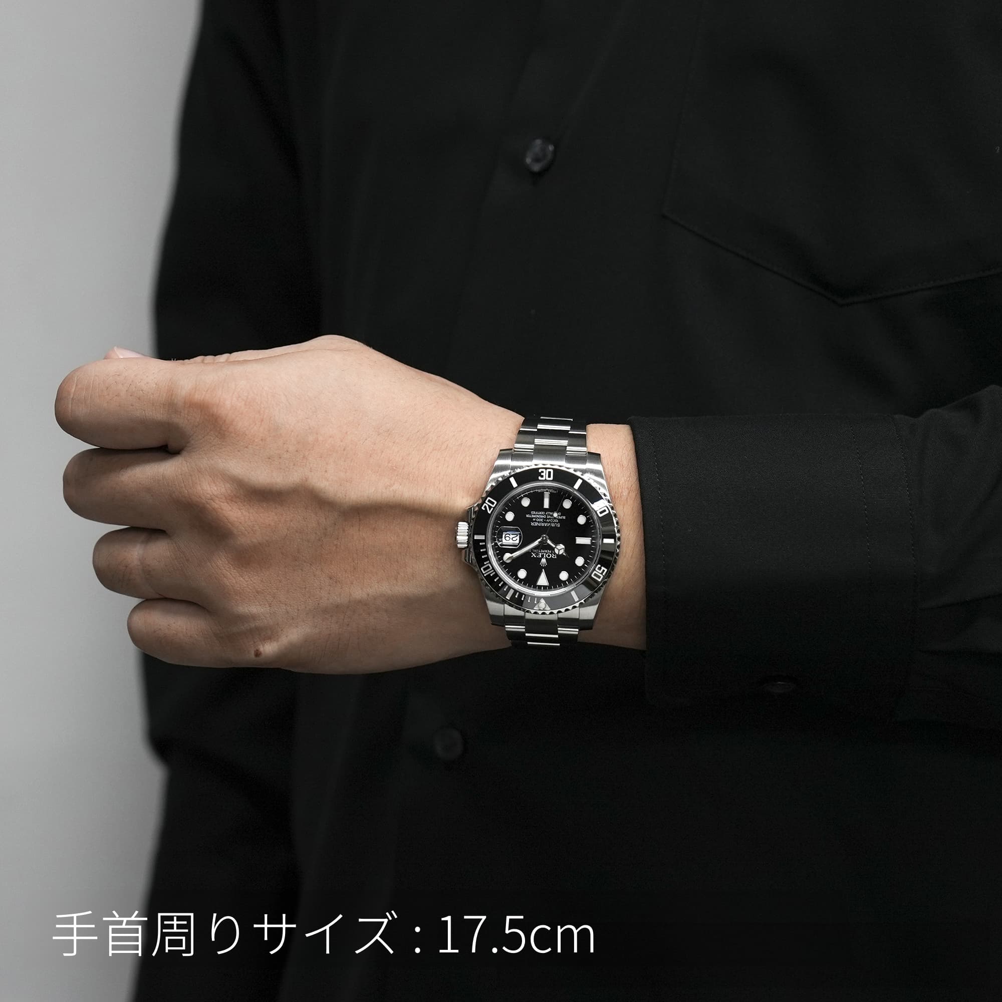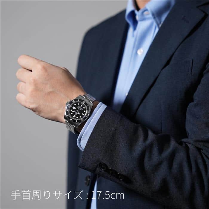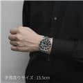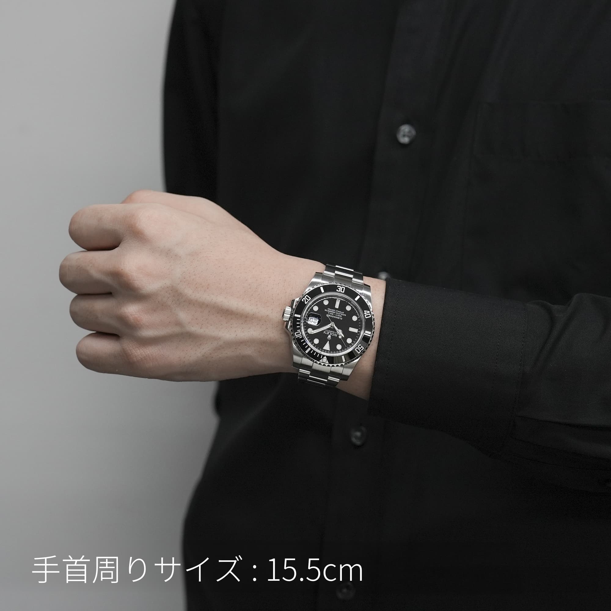 左の写真では、手首回り約15.5cmのスタッフが試着したシーンです。 スーツに合わせて装着すると、セラミック製ベゼルの輝きがより高級な雰囲気を演出してくれます。 |