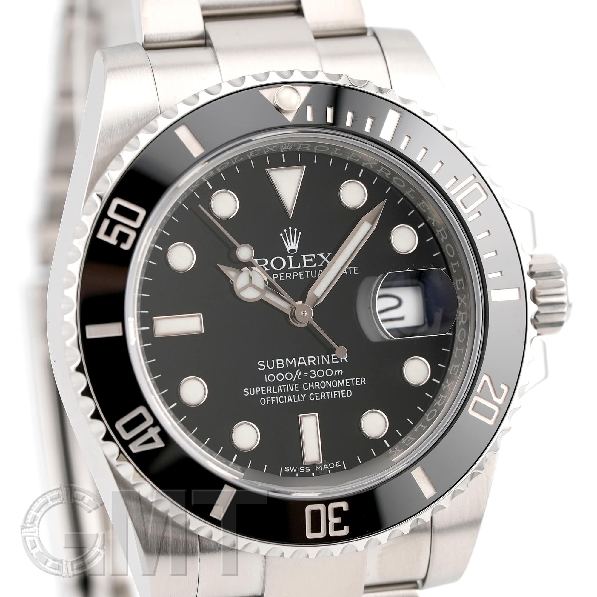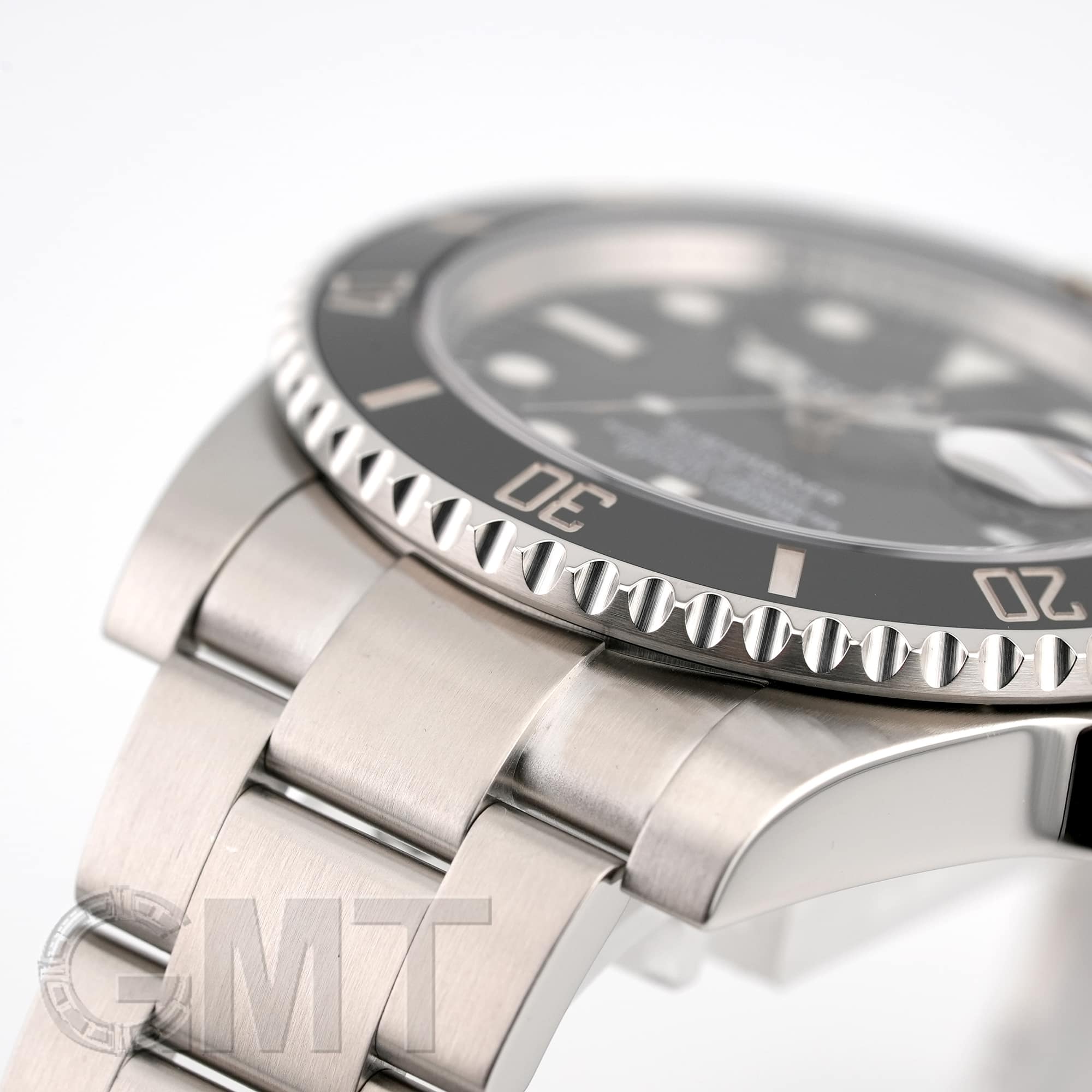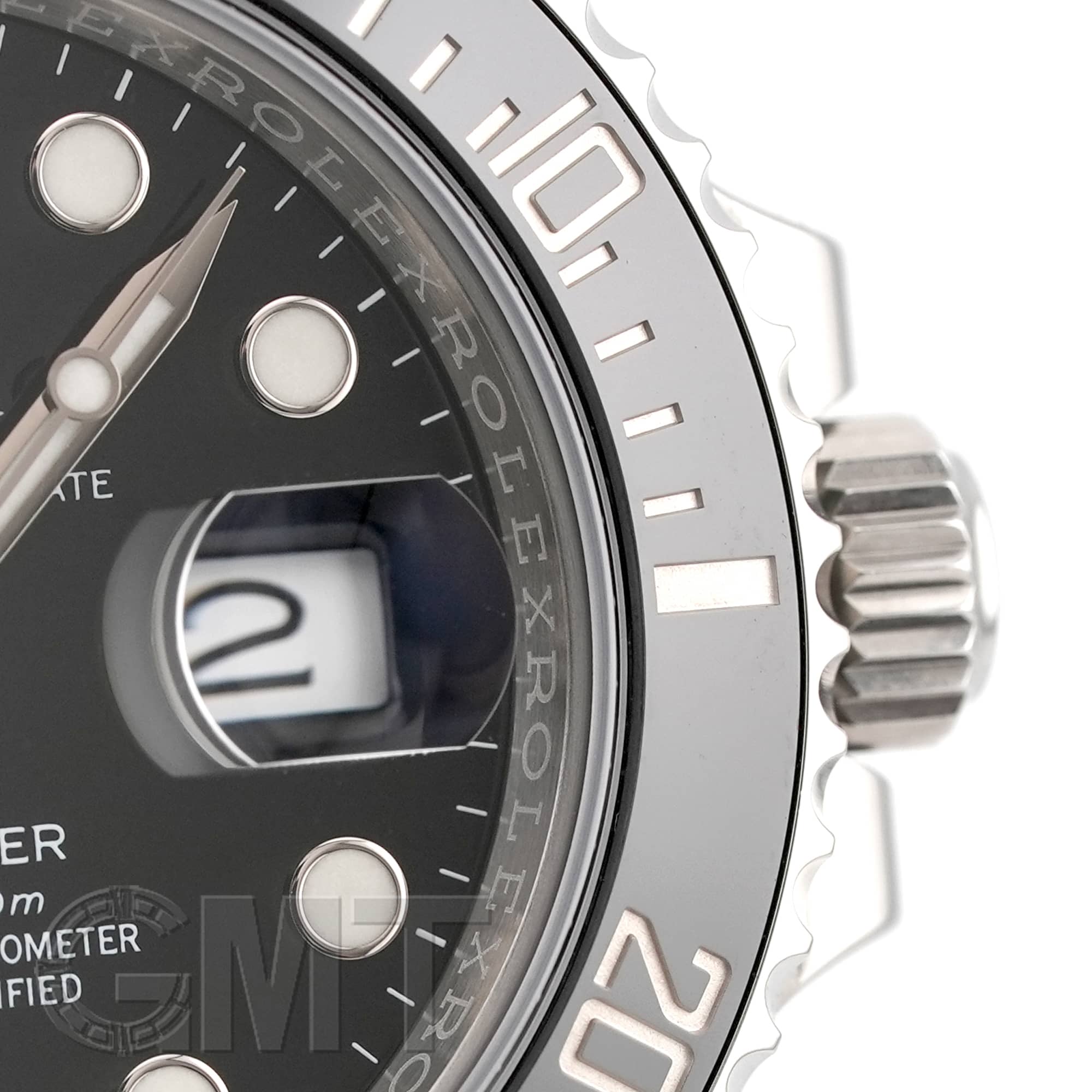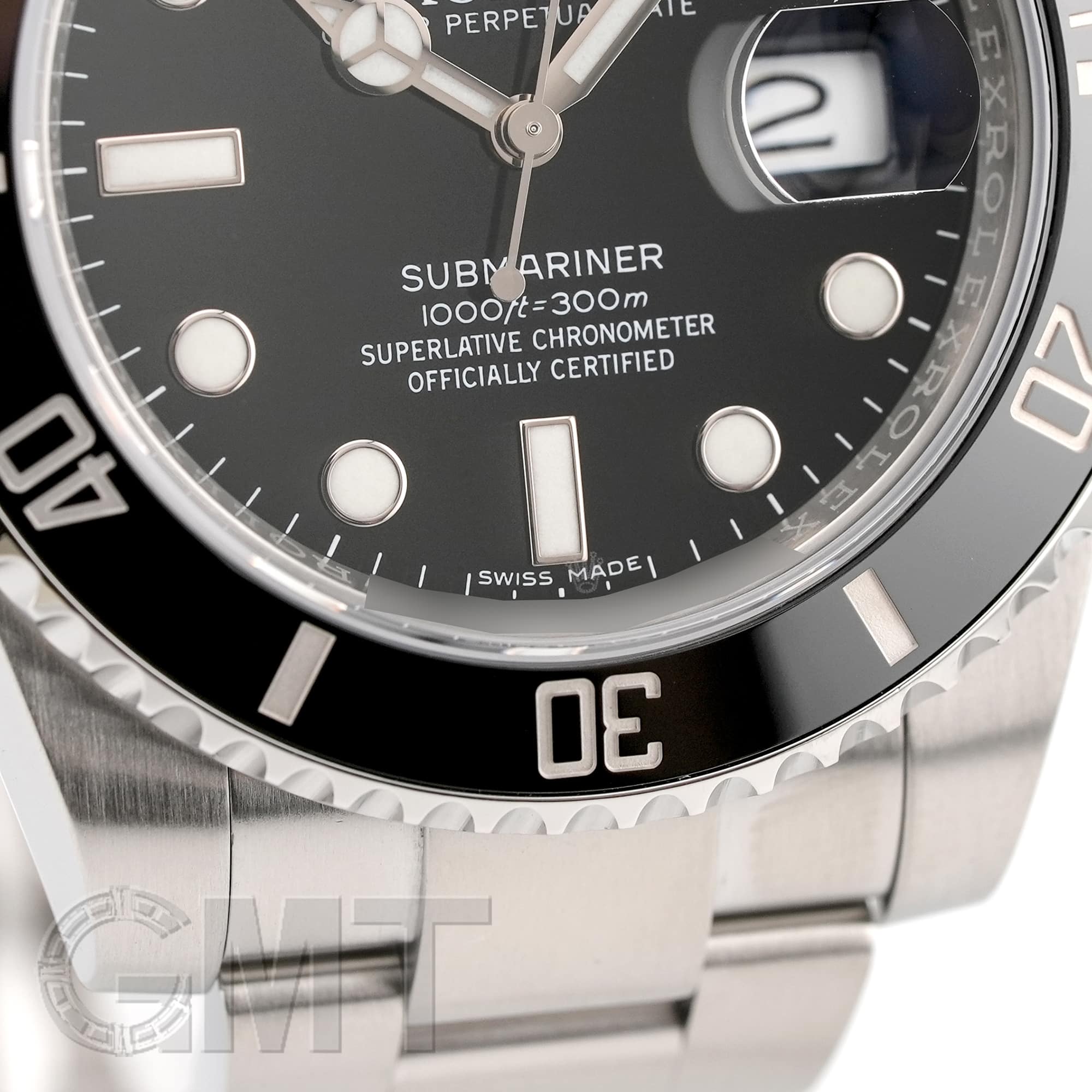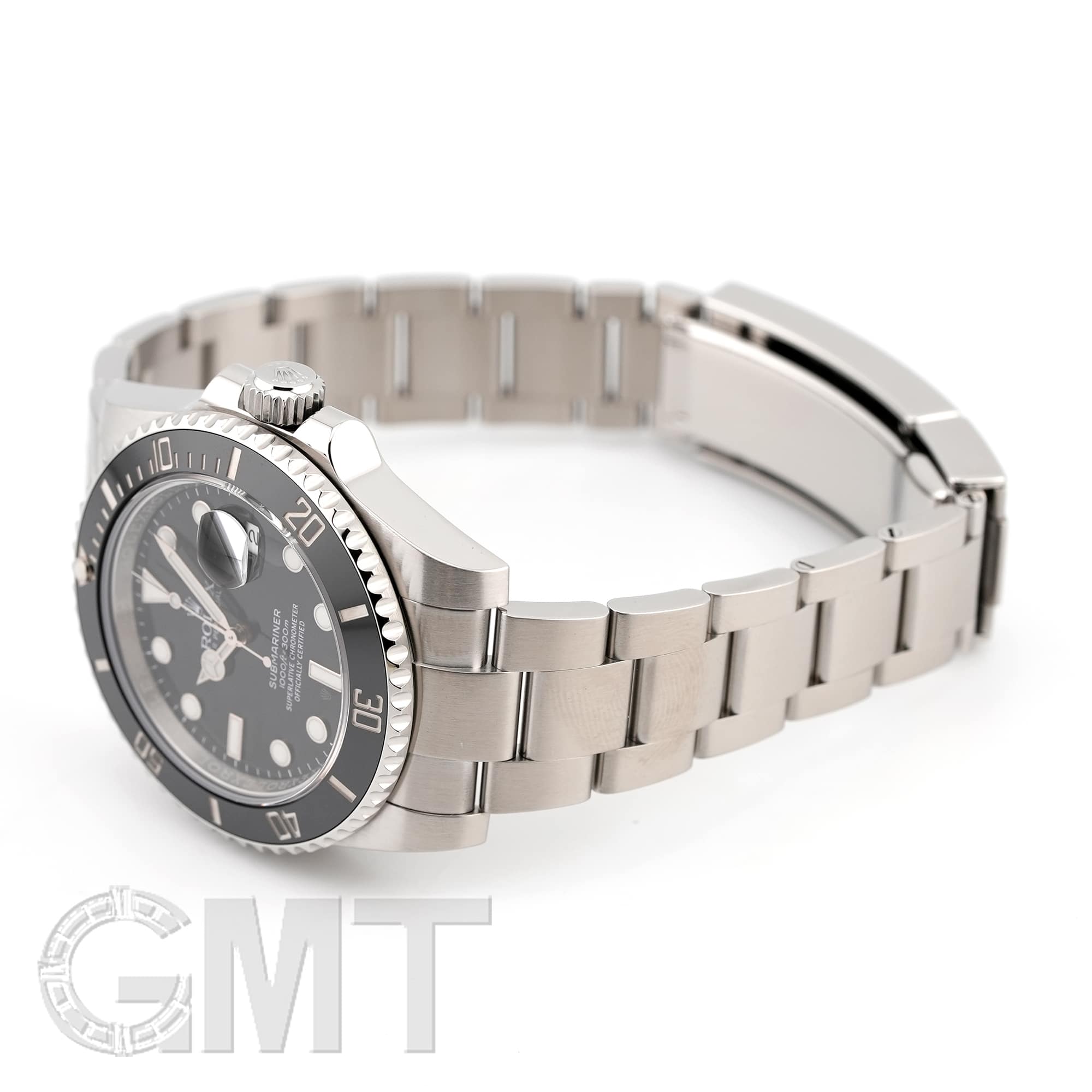 左の写真では、手首回り約15.5cmのスタッフが試着したシーンです。 スーツに合わせて装着すると、セラミック製ベゼルの輝きがより高級な雰囲気を演出してくれます。 |