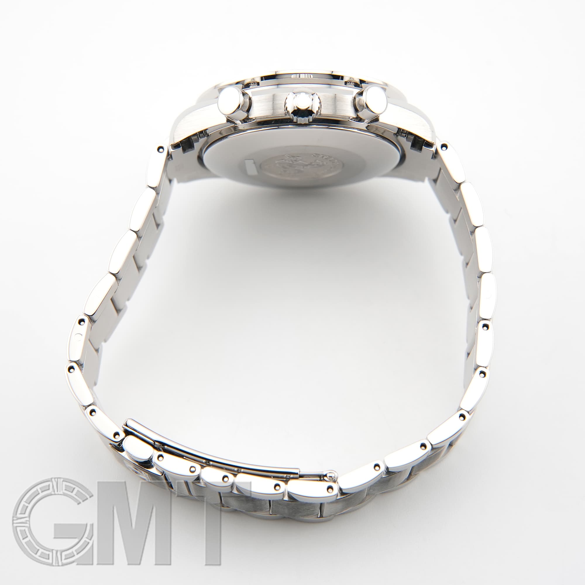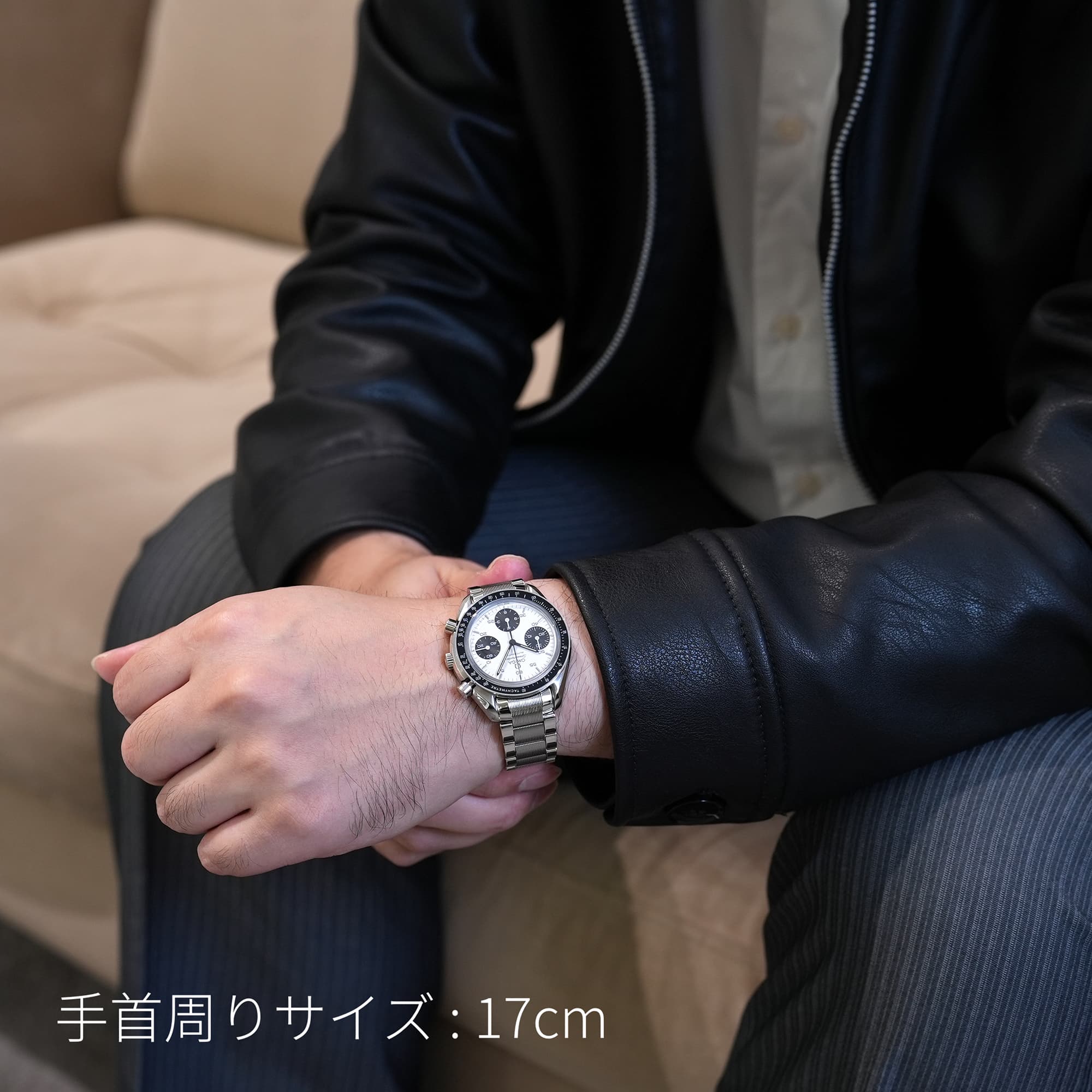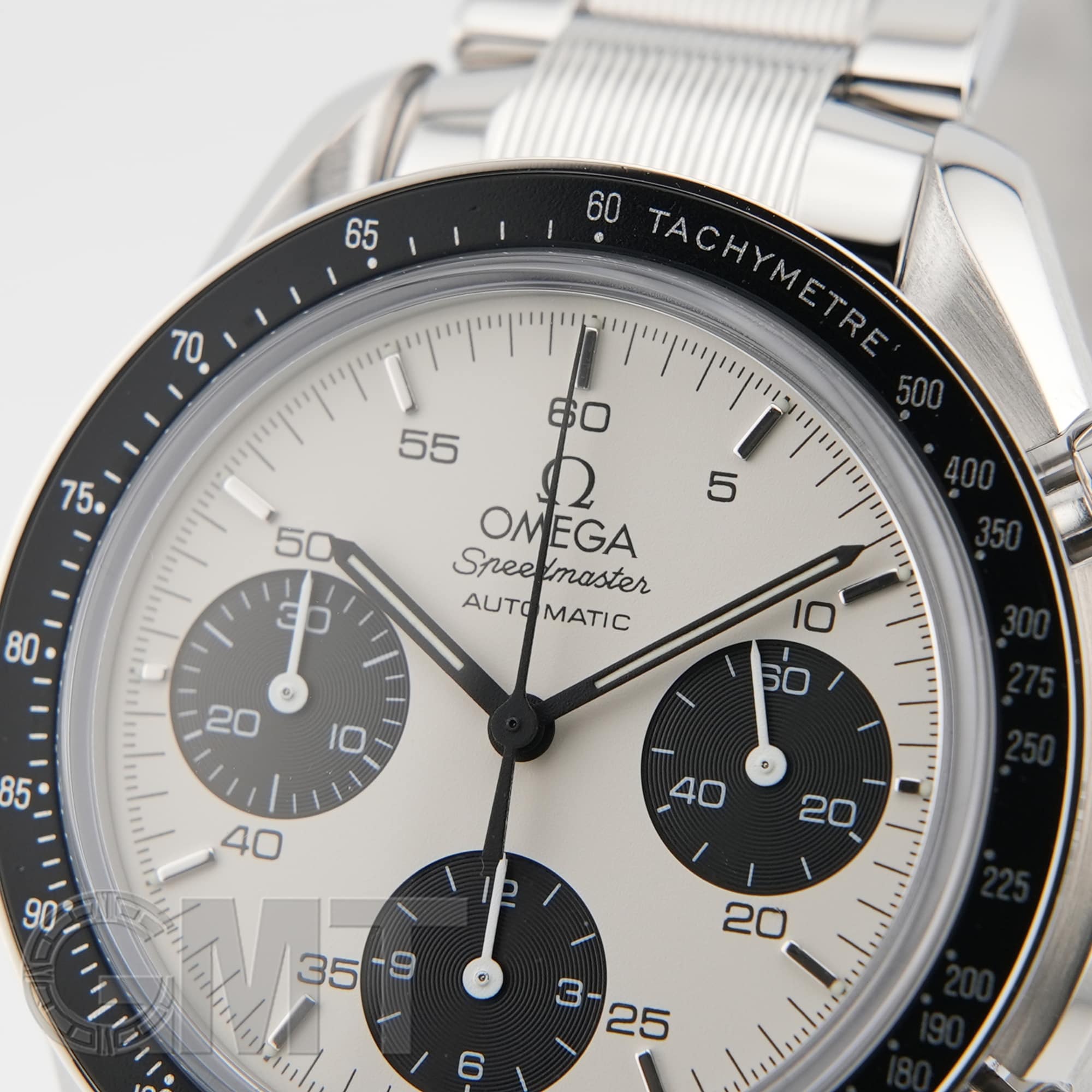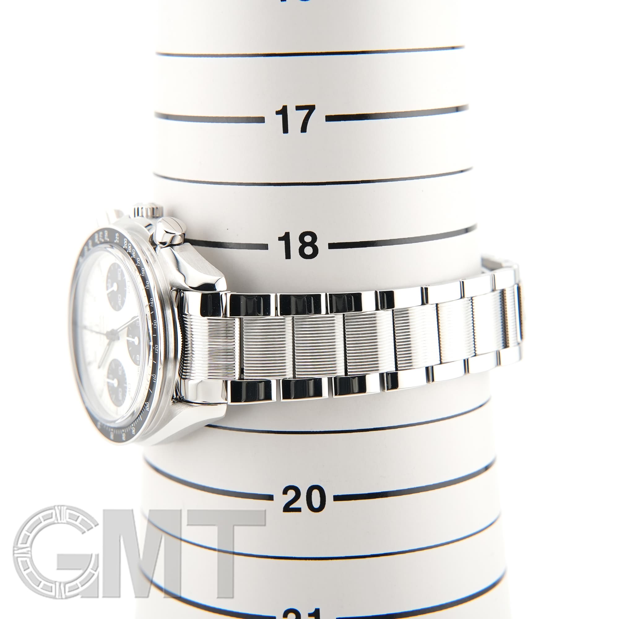 最大の特徴はブレスレットで、中央のコマのみにストライプ模様が施されたデザインは、他のスピードマスターではまず見られない特別なものとなっています。