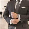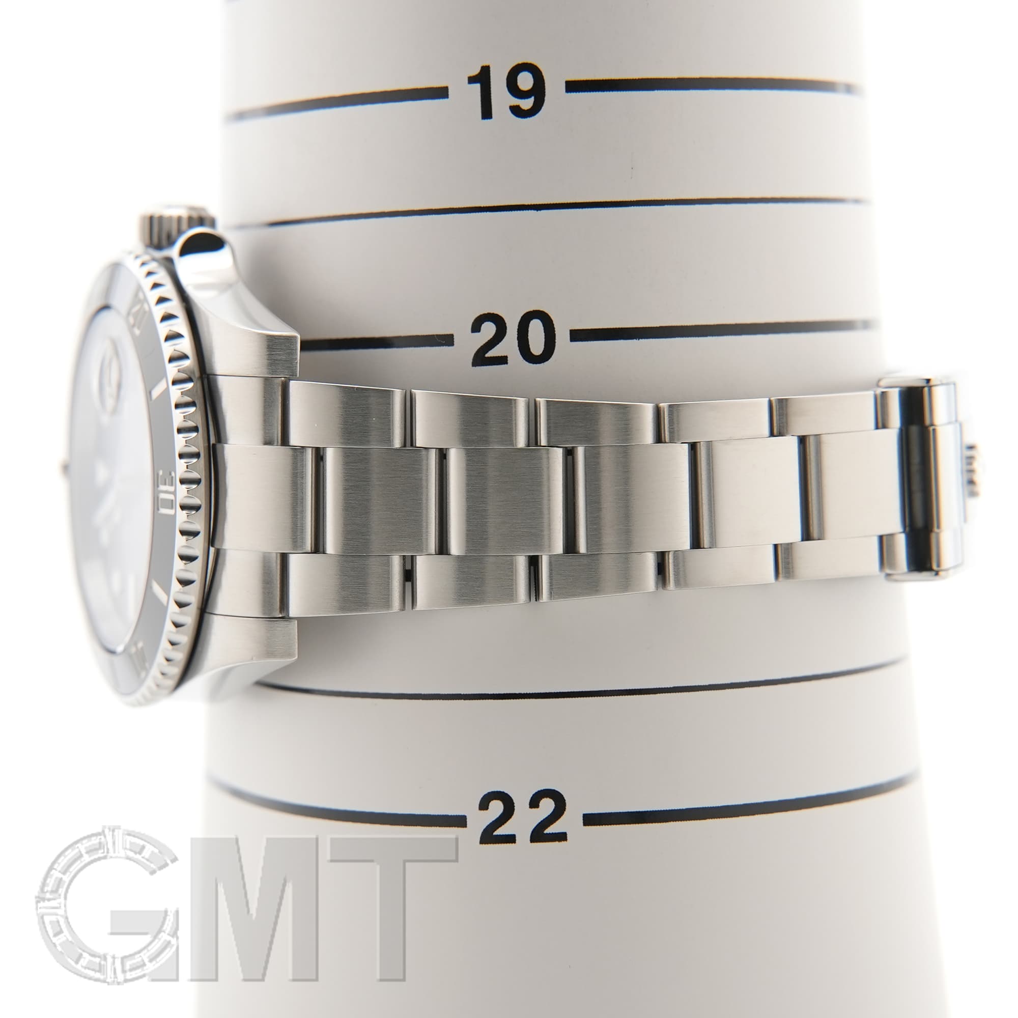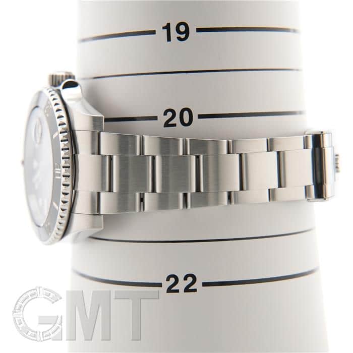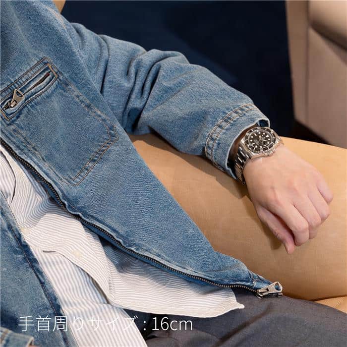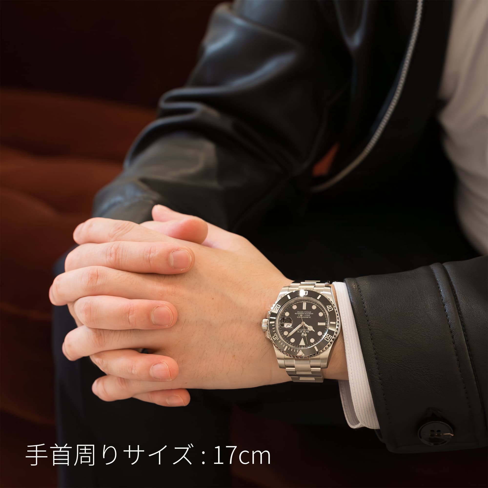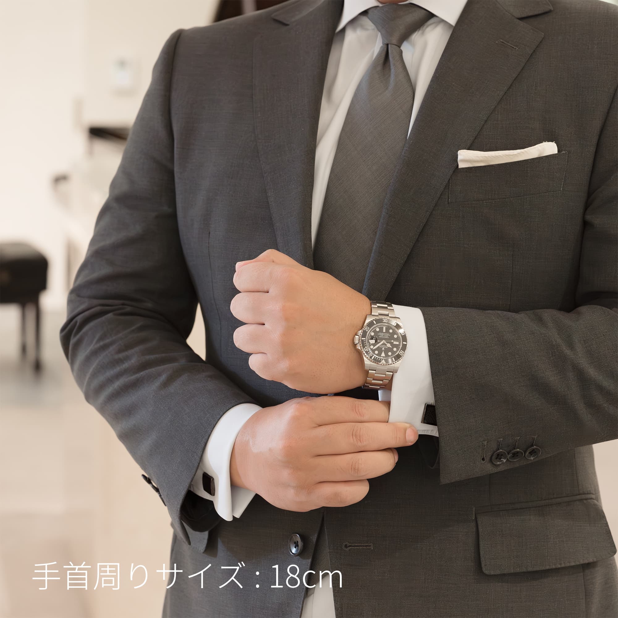 左の写真では、手首回り約15.5cmのスタッフが試着したシーンです。 スーツに合わせて装着すると、セラミック製ベゼルの輝きがより高級な雰囲気を演出してくれます。 |