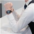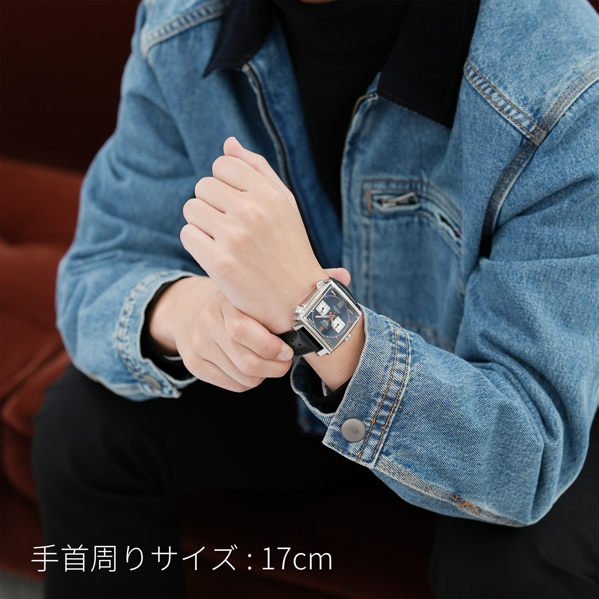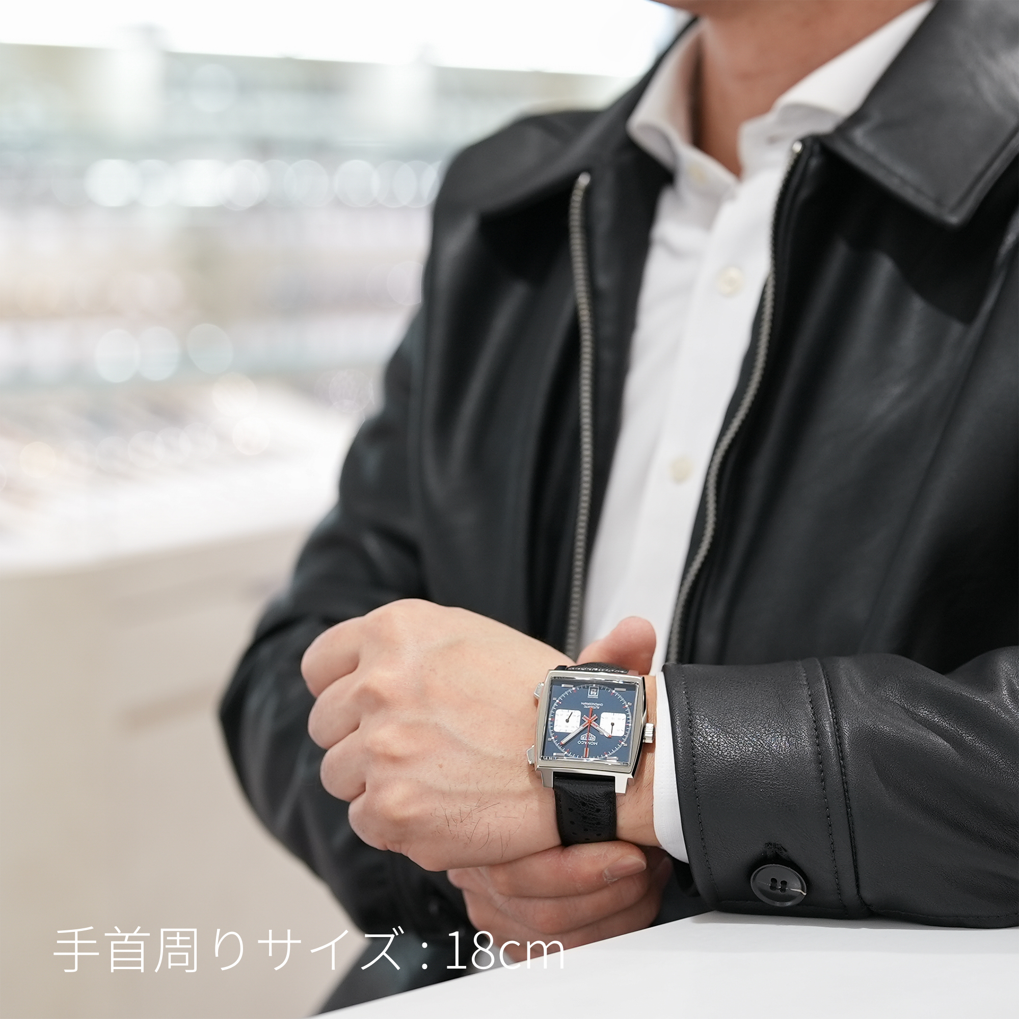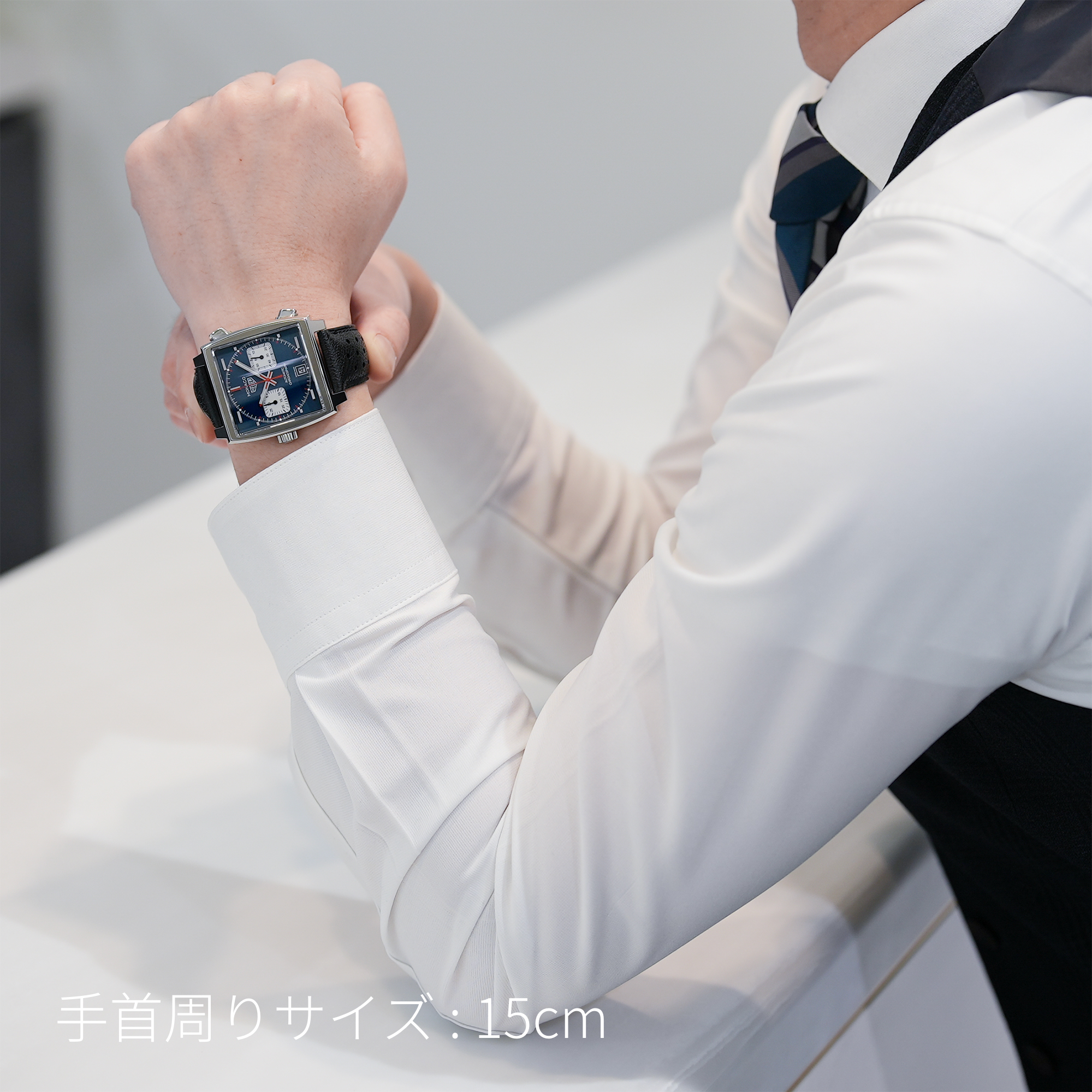 39mmのスクエアケースとレザーストラップが、洗練されたプロポーションと快適な装着感を実現。