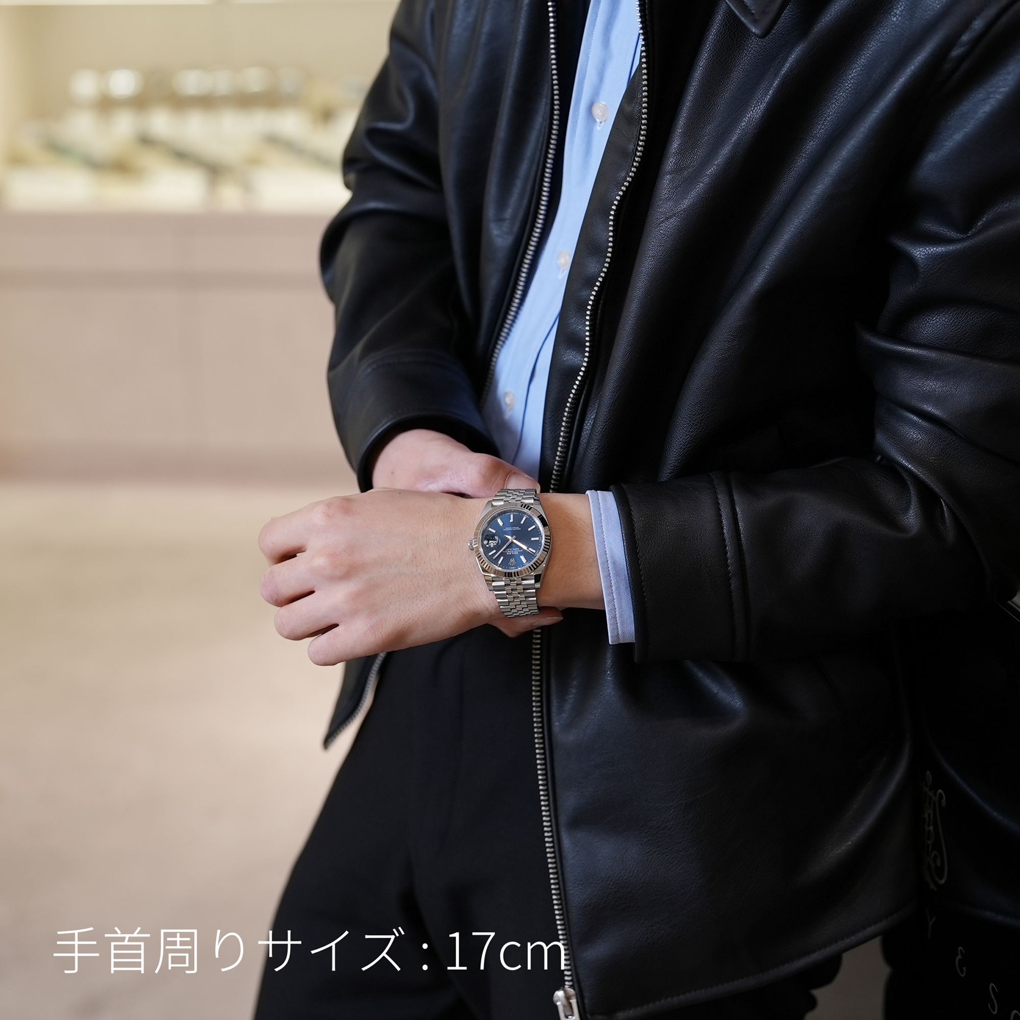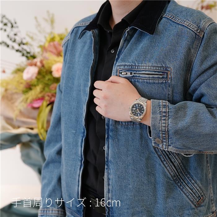 シンプルなブルー文字盤のため、ビジネスシーンにも着用できる上品さを持った1本です。